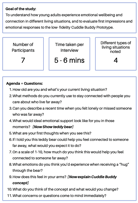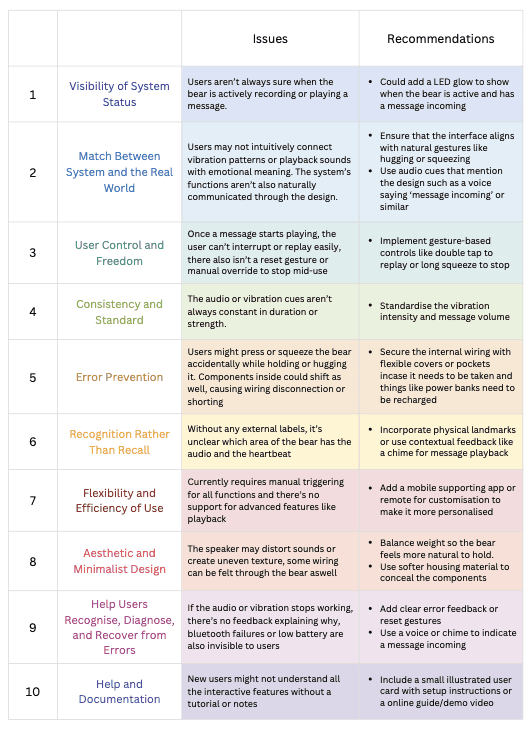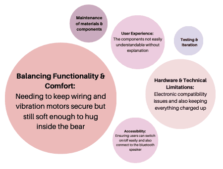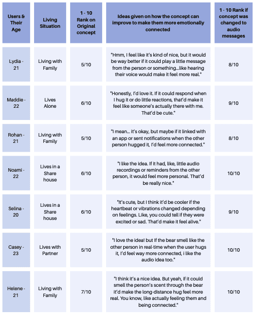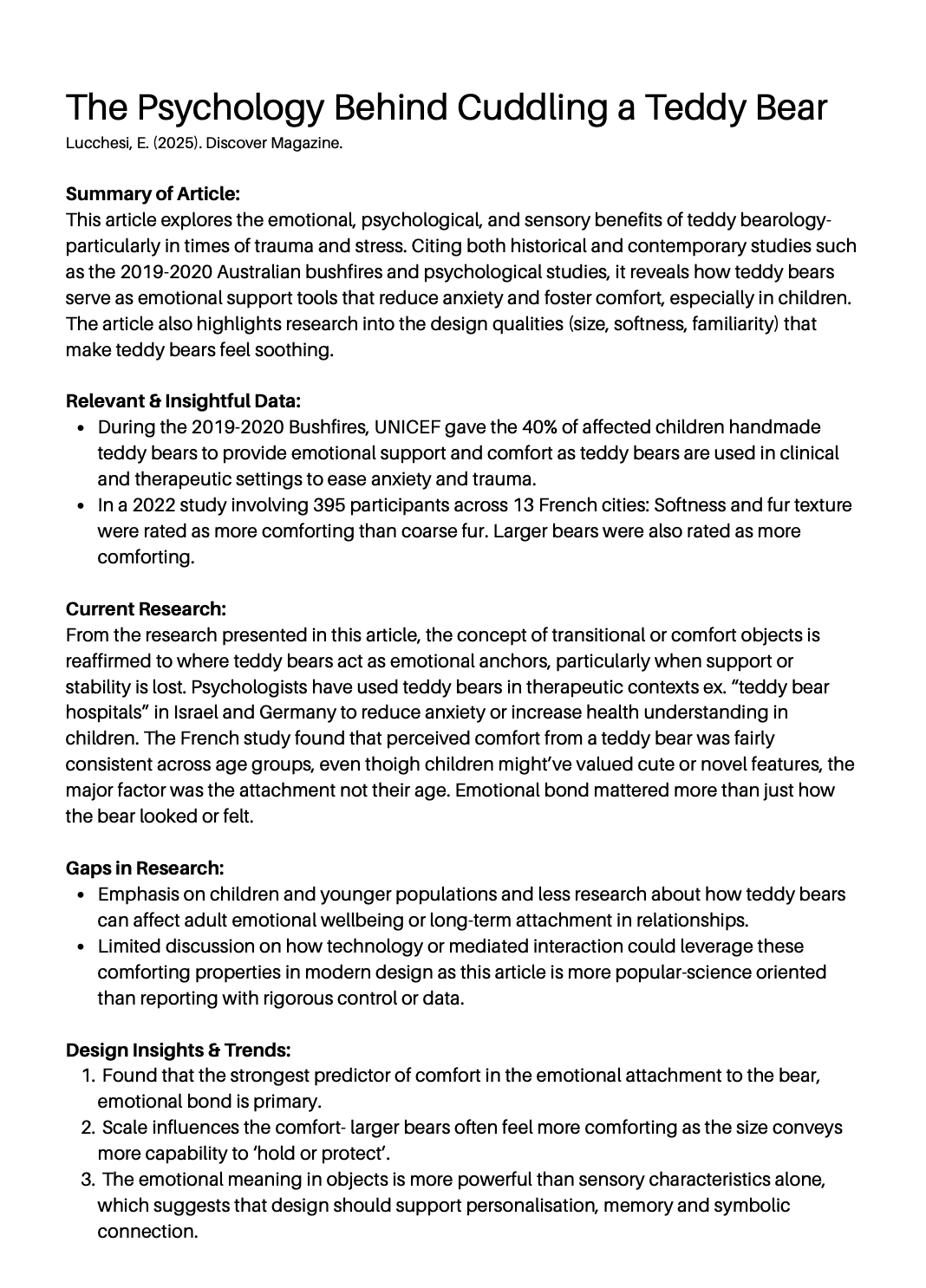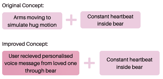 Designing Cuddle Buddy reshaped how I approach emotional and interaction design. Early in the process, I assumed that more explicit, expressive features would create stronger emotional impact. Through user testing, I learned that this wasn’t the case- participants consistently responded more positively to subtle, familiar, and passive interactions that felt emotionally grounding. This insight led me to pivot away from a mechanically expressive concept and instead focus on heartbeat haptics and voice playback, prioritising emotional resonance over visual novelty.