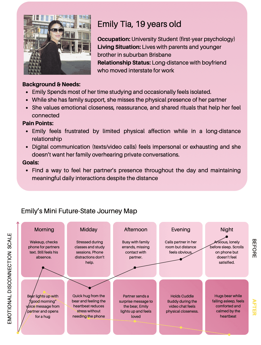 Observing how deeply physical absence can amplify heartbreak revealed a gap in how we design for emotional connection, particularly during moments of vulnerability. While digital tools enable communication, they rarely replicate the calming reassurance of physical presence.